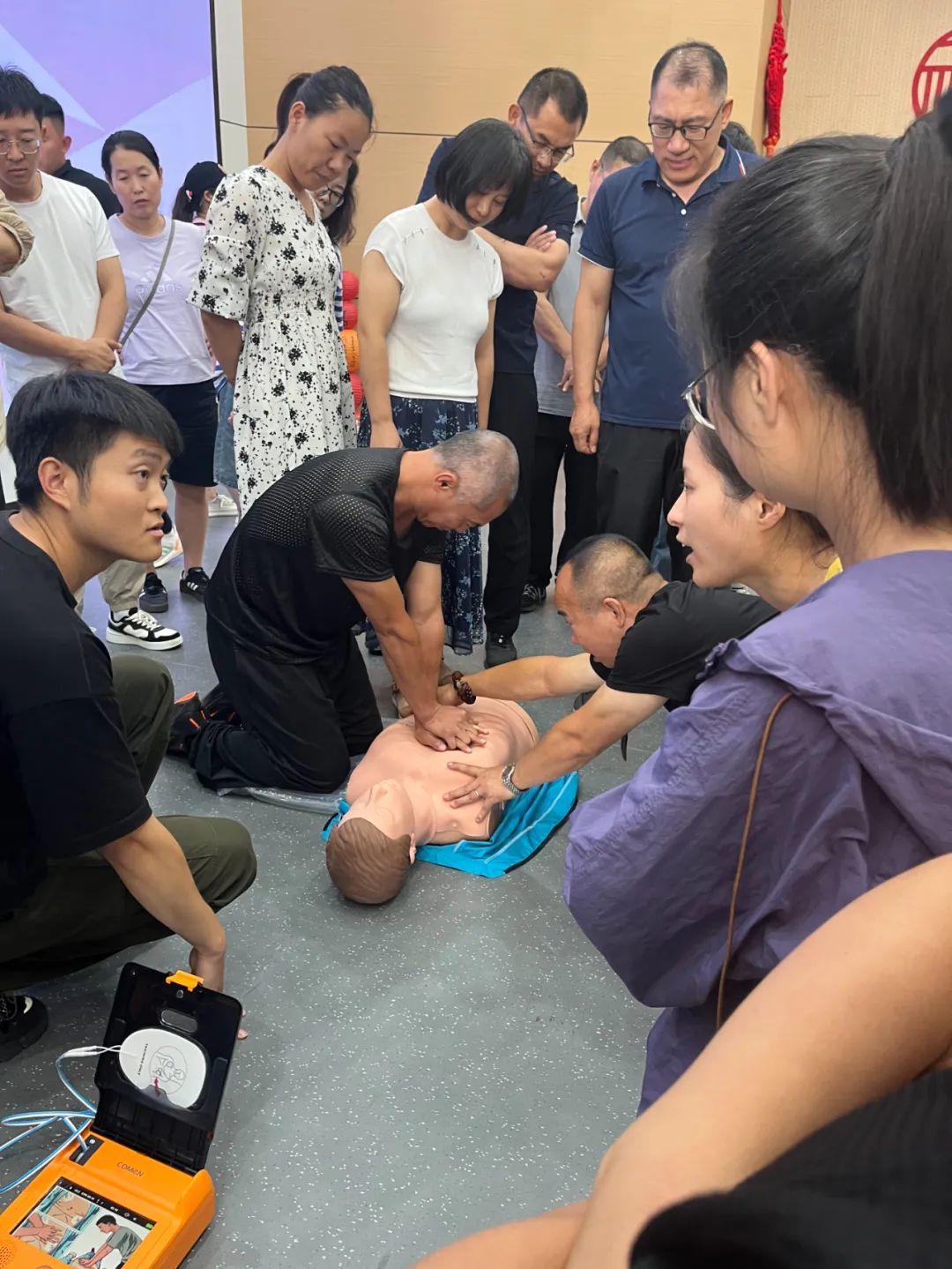 活动现场,培训讲师从心肺复苏的概述、心肺复苏的操作、AED除颤仪的操作流程和气道异物梗阻急救四方面详细讲解了心肺复苏的具体步骤和AED除颤仪的正确使用方法,还对胸外心脏按压、按压深度、按压频率等环节的操作要领和流程,逐一进行讲解和示范,并组织参训人员进行实操练习。